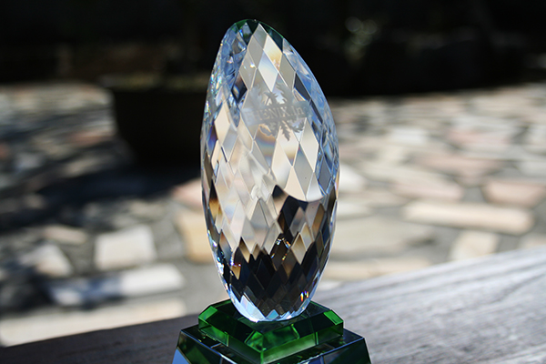 たまご型の素材に高めのスタンドをつけたトロフィー。